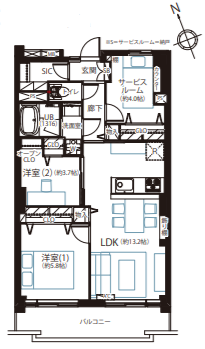 専有面積57.66㎡の2SLDKは、居室に加えてサービスルームを備えた使い勝手の良い間取り。テレワークスペースや収納としても活用でき、ライフスタイルに合わせた使い方が可能です。